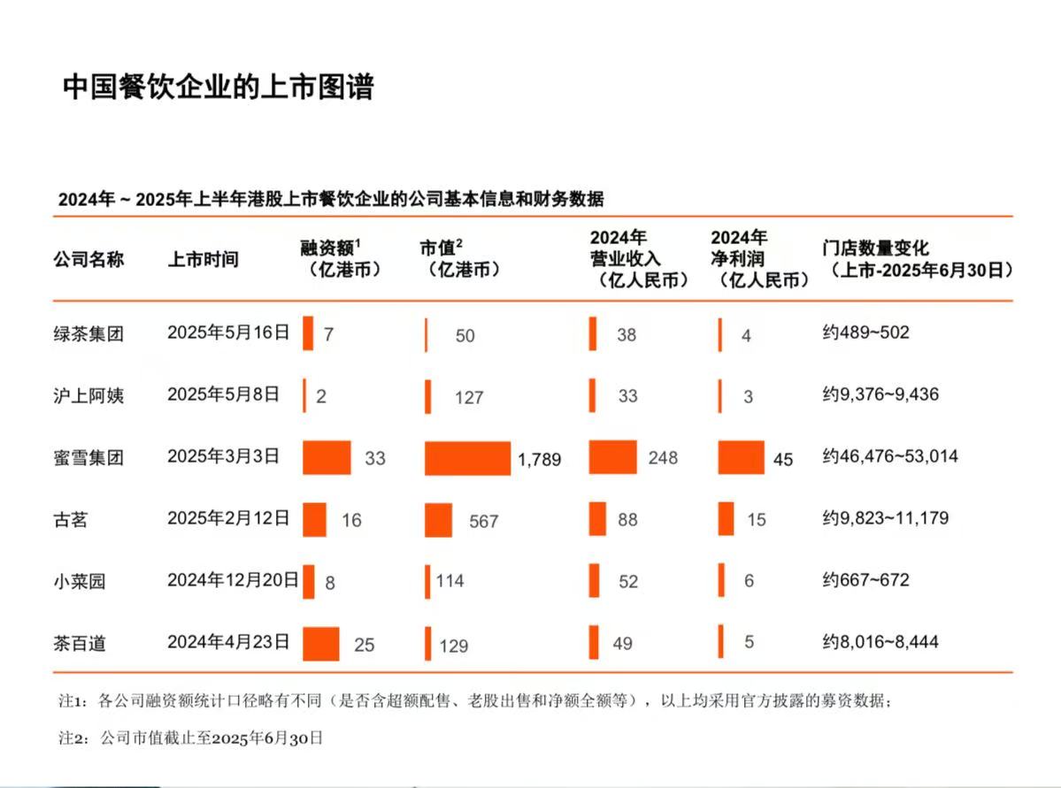 2024年,茶百道、小菜园和古茗等企业成功在香港IPO;2025年,蜜雪集团、牛大人、沪上阿姨和遇见小面等成功在香港IPO;另有老乡鸡和巴奴毛肚火锅等向港交所更新招股书。