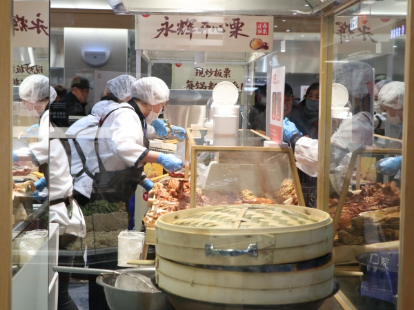 3R(即食即烹即热)板块实现深度整合。门店创新地将熟食、小吃等档口整合为“小吃一条街”,并毗邻设置就餐区。烘焙区采用环岛式陈列,面点师在内场操作,增强体验感。同时,北京稻香村、八珍王等老字号及地方特色品牌的引入,进一步丰富了即时餐饮选择,让“逛吃”成为现实。有顾客表示:“买完海鲜可以直接请师傅加工,在旁边吃完再回家,像下馆子一样方便,幸福感提升了。”