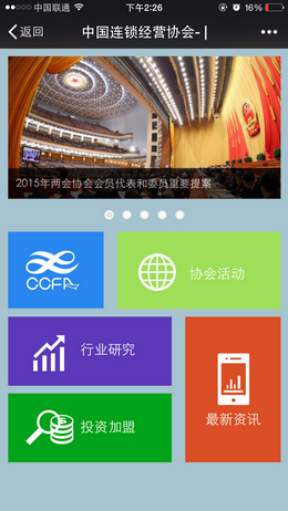 3月16日,中国连锁经营协会(CCFA)微官网wei.ccfa.org.cn正式上线。为方便广大会员和业内人士随时随地了解行业信息和协会动态,协会特别开发移动版官方网站,集合协会活动、最新资讯、行业研究、和投资加盟信息等内容于一体,经过2个月的开发与测试,于今天正式推出。