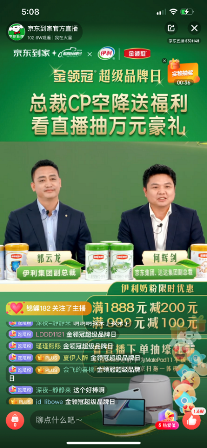 京东到家携手伊利金领冠打造“超级品牌日”活动,并在4月16日首次开启京东到家、京东双平台万店直播,邀请伊利集团副总裁郭云龙和达达集团副总裁、京东集团副总裁何辉剑组成总裁CP,做客京东到家直播间带货。